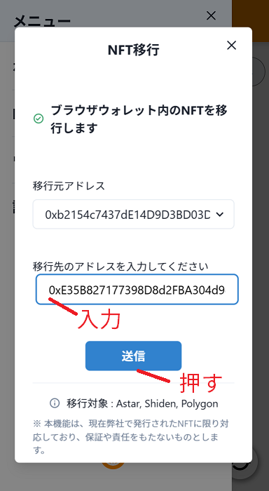 メニューから「NFT移行」を選択してください